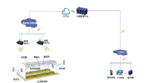 智慧温室大棚智能感知控制系统解决方案是基于当前的传感技术、无线通信技术、自动控制技术、计算机技术等,实时采集空气温湿度、光照强度、二氧化碳浓度、土壤水分、土壤湿度、土壤PH值等环境数据,通过大数据模型自动分析,并智能调控相关控制器开关放风口、卷帘、水阀、通风机、水帘、遮阳网、水肥一体化机等设备,自动调控温室环境,达到最适宜作物生长的状态,减少人力,节水节电,并提高作物质量和产量。       智慧温室大棚智能感知控制系统还可拆分为智能放风控制系统、智能遮阳控制系统、智能卷帘控制系统、智能节水灌溉控制系统(喷雾、滴管等)、智能水肥一体控制系统等子系统,皆可单独使用
